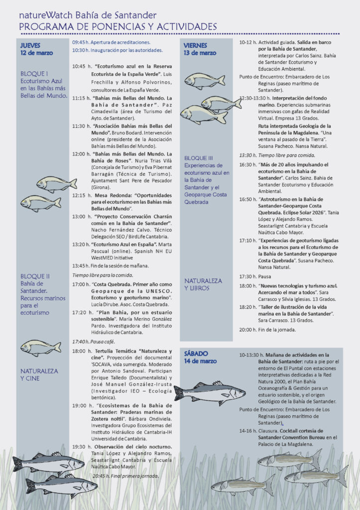 El próximo Encuentro Turismo Observación de la Naturaleza, natureWatch, que se celebrará de 12 a 14 de marzo en Santander, este año está enfocado a la Bahía de Santander y los recursos y oportunidades que ofrece para el desarrollo del ecoturismo responsable, más concretamente ecoturismo centrado en el mar y en los ambientes costeros.