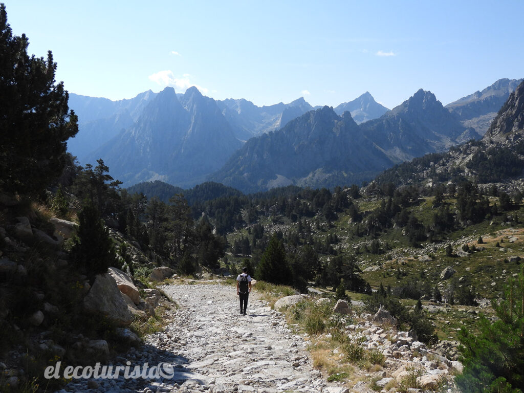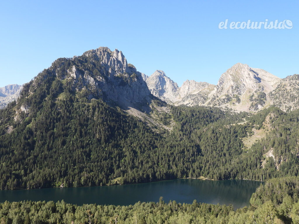 La primera tentación, que no debemos pasar por alto es el Estany de Amitges, enmarcado por las agujas rocosas de Amitges. Al otro lado del circo rocoso, se encuentra el valle de Arán. Desde la presa de este lago se dominan unas panorámicas de ensueño también hacia el sur, con las grandes cimas de Peguera, Monestero, Els Encantats, Fonguero… picos que rozan los tres mil metros de altitud.