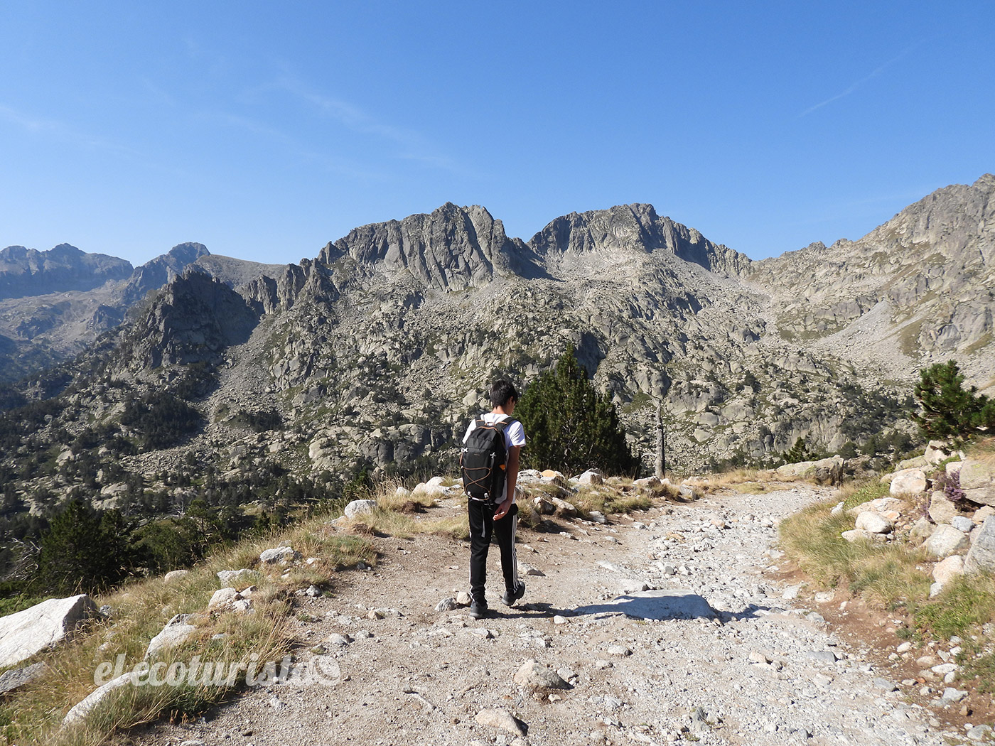 De nuevo en la puerta del refugio de Amitges, comenzamos la bajada por la pista. Las primeras lazadas del trazado son las de desnivel más acusado, pero siempre con la recompensa visual de las panorámicas y evitando la notable fatiga de hacerlo en subida. Es un terreno descarnado, desprovisto de vegetación arbórea. Entre los caos de roca junto a la pista, en los prados donde crece la hierba, es posible ver a las siempre alertas marmotas. Sus siluetas corretean entre los huecos de los grandes bloques de granito. Vale la pena dedicar un rato a buscarlas. Es buena zona también para tratar de observar rebecos o gamos.