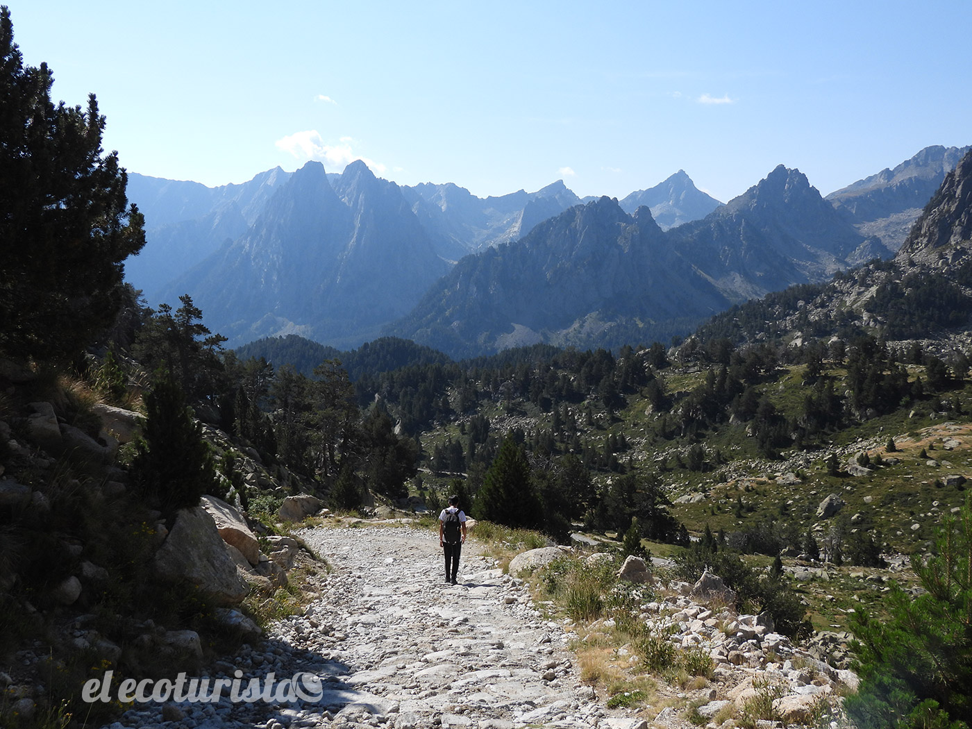 El estany de la Cabana y más abajo el estany de Ratera, nos recuerdan que los lagos son elementos representativos de este rincón pirenaico. Pero entre ambos, un desvío a la derecha nos invita a caminar unos pasos por esta pista que sube al Portarró de Espot y asomarnos al mirador de l’Estany. Un balcón natural sobre la gran lámina del Estany de San Maurici, que desde aquí parece incluso pequeño. Desandamos camino para regresar a la pista y proseguir el descenso, pasando ahora sí junto al bello estany de Ratera y dar vista al Sant Maurici.